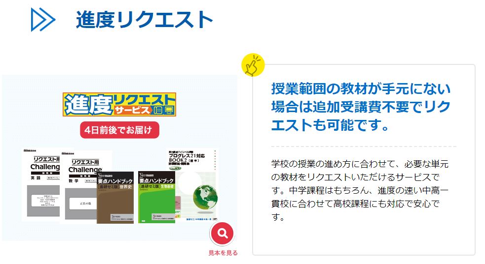 学校の進度に試験ゼミが追いついていない時は、進度リクエストで連絡すれば早めに届けてくれるサービスもあります。